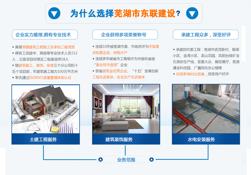 蕪湖市東聯(lián)建設(shè)有限公司,創(chuàng)建于1995年,具備建筑工程施工總承包貳級(jí)資質(zhì)、市政公用工程施工總承包叁級(jí)資質(zhì)、建筑裝飾裝修專(zhuān)業(yè)承包貳級(jí)資質(zhì)。公司擁有工民建中、高級(jí)等專(zhuān)業(yè)技術(shù)人員189人,一級(jí)建造師12人、二級(jí)建造師18人,內(nèi)設(shè)8個(gè)部門(mén),轄建筑施工、裝飾、安裝三個(gè)分公司和十五個(gè)項(xiàng)目部,年建筑施工能力100萬(wàn)平方米。 公司于2015年10月優(yōu)化重組后,先后設(shè)立了安徽東聯(lián)建筑勞務(wù)有限公司、蕪湖東聯(lián)投資管理有限公司、蕪湖久百汽車(chē)零部件有限公司三家子公司,爭(zhēng)取多方位發(fā)展,綜合提升公司實(shí)力。 公司宗旨:以人為本,用戶(hù)至上,以誠(chéng)信,務(wù)實(shí)求真,銳意進(jìn)取,追求卓越。認(rèn)真堅(jiān)持“一心一意情系顧客百年大業(yè),一磚一石質(zhì)量責(zé)任重于泰山”的質(zhì)量方針。以科學(xué)的嚴(yán)謹(jǐn)管理,前瞻的經(jīng)營(yíng)群體,精益求精的施工工藝,至誠(chéng)周到的服務(wù)體系在建筑行業(yè)率先通過(guò)ISO9001質(zhì)量管理體系認(rèn)證,承建的代表工程:蕪湖市吉茂新村、銀湖小區(qū)、金灣小區(qū)、龍山花園、鳳陽(yáng)臺(tái)玻礦業(yè)石英砂生產(chǎn)線(xiàn)、亞夏大眾、解放展廳、蕪湖通全科技園、廣福綜合辦公樓等。優(yōu)良率較高,深受用戶(hù)好評(píng)。 公司(集團(tuán))連續(xù)10年被蕪湖市委、市政府評(píng)...更多>